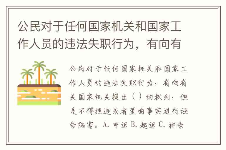 公民对于任何国家机关和国家工作人员的违法失职行为,有向有关国家机关提出()的权利,但是不得捏造或者歪曲事实进行诬告陷害。A.申诉 B.起诉 C.控告 D.检举