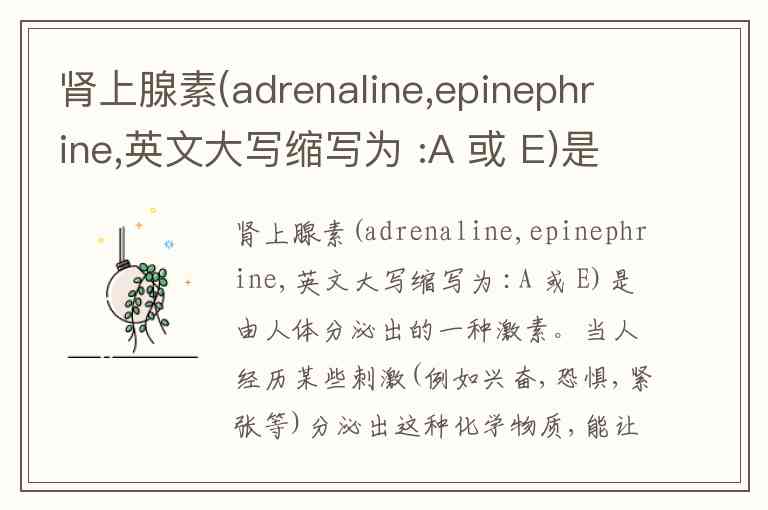 肾上腺素(adrenaline,epinephrine,英文大写缩写为 :A 或 E)是由人体分泌出的一种激素。当人经历某些刺激(例如兴奋,恐惧,紧张等)分泌出这种化学物质,能让人呼吸加快(提供大量氧气),心跳与血液流动加速,瞳孔放大,为身体活动提供更多能量,使反应更加快速。 A. 正确 B. 错误