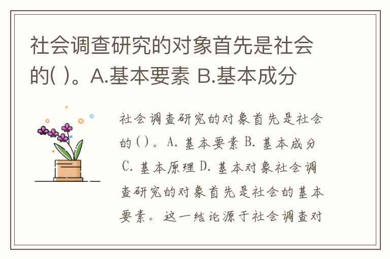 社会调查研究的对象首先是社会的( )。A.基本要素 B.基本成分 C.基本原理 D.基本对象