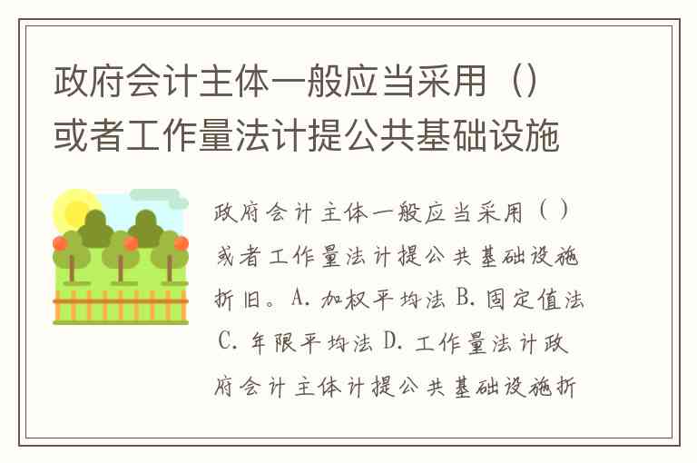 政府会计主体计提公共基础设施折旧时,一般应当采用年限平均法或者工作量法。这一规定源自《政府会计准则第5号——公共基础设施》的明确要求,旨在根据资产性质和使用情况选择最适宜的折旧方式。