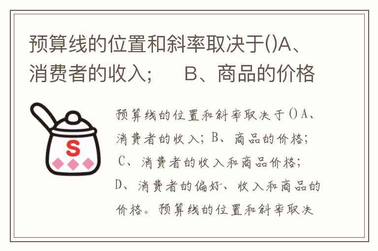 预算线的位置和斜率取决于()A、消费者的收入; B、商品的价格; C、消费者的收入和商品价格; D、消费者的偏好、收入和商品的价格。