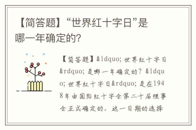 “世界红十字日”是在1948年由国际红十字会第二十届理事会正式确定的。这一日期的选择具有特殊意义——5月8日是红十字运动创始人亨利·杜南的诞辰,以此纪念他1863年发起成立国际红十字会的历史性贡献。