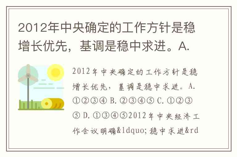 2012年中央确定的工作方针是稳增长优先,基调是稳中求进。A.①②③④ B.②③④⑤ C.①②③⑤ D.①③④⑤