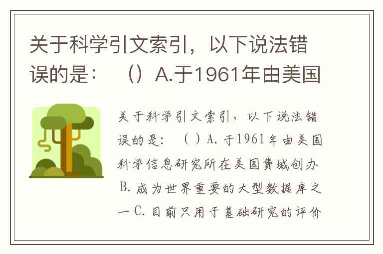 关于科学引文索引,以下说法错误的是: ()A.于1961年由美国科学信息研究所在美国费城创办 B.成为世界重要的大型数据库之一 C.目前只用于基础研究的评价体系 D.科学研究成果评价一项重要依据
