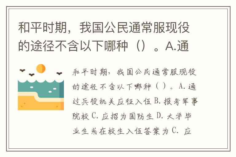 和平时期,我国公民通常服现役的途径不含以下哪种()。A.通过兵役机关应征入伍 B.报考军事院校 C.应招为国防生 D.大学毕业生或在校生入伍
