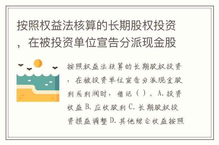 按照权益法核算的长期股权投资,在被投资单位宣告分派现金股利或利润时,借记()。A.投资收益 B.应收股利 C.长期股权投资损益调整 D.其他综合收益