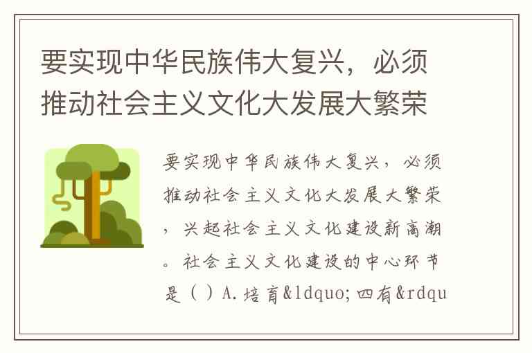 要实现中华民族伟大复兴,必须推动社会主义文化大发展大繁荣,兴起社会主义文化建设新高潮。社会主义文化建设的中心环节是()A.培育“四有”公民 B.发展教育科学文化事业 C.社会主义思想道德建设 D.坚持中国特色社会主义理论体系