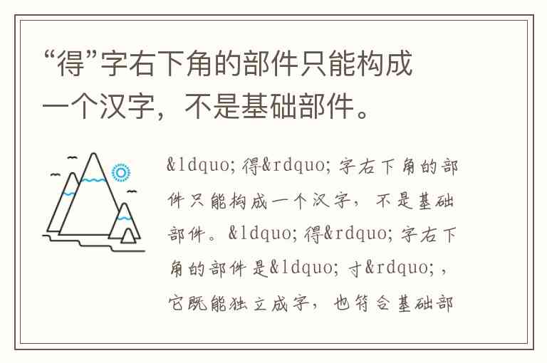 从字形结构看,“得”可分解为“彳、日、一、寸”等部件。其中右下角的“寸”本身就是独立汉字,读作“cùn”,本义为长度单位,如“尺寸”“一寸光阴”。在汉字构形系统中,基础部件指能独立使用且不可再拆分的最小构字单位,“寸”显然满足这一条件——它不仅可单独成字,还能作为构字成分组成“时、村、付”等多个汉字,并非“只能构成一个汉字”。