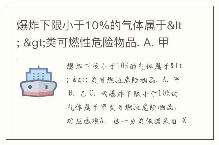 爆炸下限小于10%的气体属于< >类可燃性危险物品. A. 甲 B. 乙 C. 丙