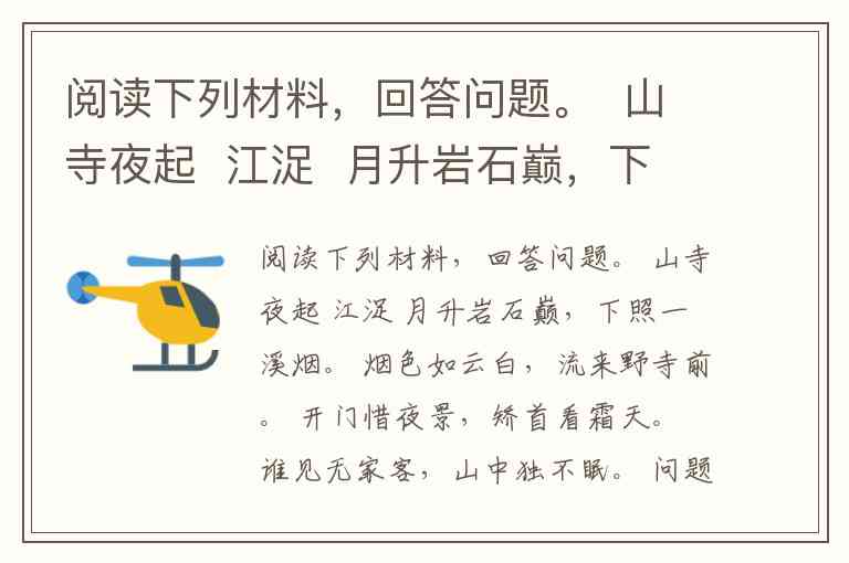 阅读下列材料,回答问题。 山寺夜起 江浞 月升岩石巅,下照一溪烟。 烟色如云白,流来野寺前。 开门惜夜景,矫首看霜天。 谁见无家客,山中独不眠。 问题: (1)三、四两句中的“烟”有哪些特点?诗人是如何描写的? (2)结合全诗分析诗人“不眠”的原因。