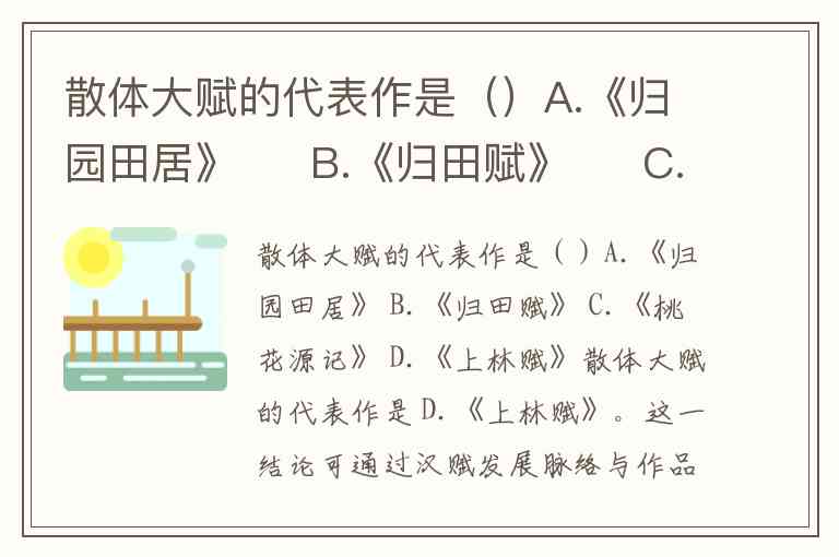 散体大赋的代表作是()A.《归园田居》 B.《归田赋》 C.《桃花源记》 D.《上林赋》