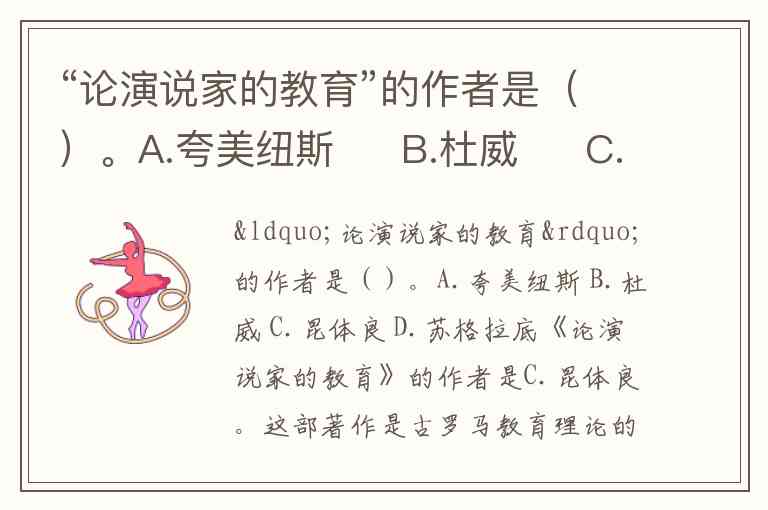 《论演说家的教育》的作者是C.昆体良。这部著作是古罗马教育理论的巅峰之作,由昆体良(Marcus Fabius Quintilianus)在公元1世纪末完成,原题为《雄辩术原理》,是西方历史上第一部系统论述教育问题的专著,也被誉为古代西方的“教学法百科全书”。