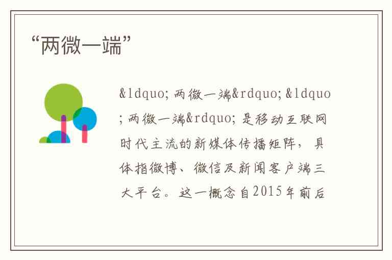 “两微一端”是移动互联网时代主流的新媒体传播矩阵,具体指微博、微信及新闻客户端三大平台。这一概念自2015年前后被广泛使用,已成为媒体融合与政务传播的核心载体,其名称中的“两微”对应社交媒体形态,“一端”则指向移动信息聚合平台。