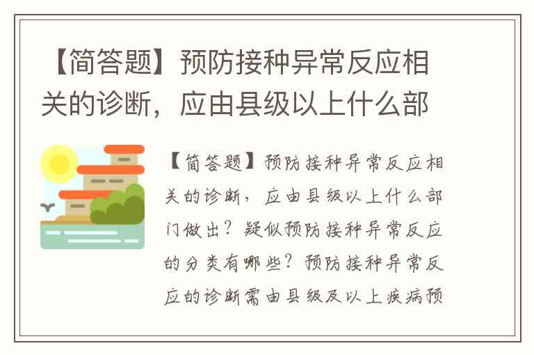 【简答题】预防接种异常反应相关的诊断,应由县级以上什么部门做出?疑似预防接种异常反应的分类有哪些?