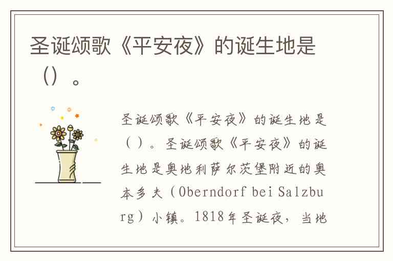 圣诞颂歌《平安夜》的诞生地是奥地利萨尔茨堡附近的奥本多夫(Oberndorf bei Salzburg)小镇。1818年圣诞夜,当地神父约瑟夫·穆尔(Joseph Mohr)与小学教师弗朗茨·格吕伯(Franz Gruber)在此合作创作了这首经典颂歌。当时因教堂管风琴被老鼠咬坏无法使用,两人临时以吉他伴奏完成了首次演唱,这一偶然事件催生了后来传遍全球的圣诞旋律。