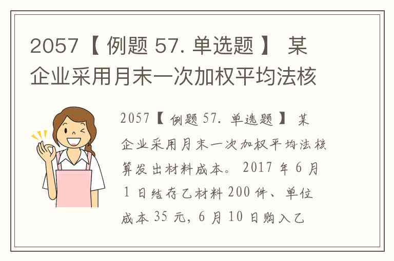 2057【 例题 57. 单选题 】 某企业采用月末一次加权平均法核算发出材料成本。 2017 年 6 月 1 日结存乙材料 200 件、单位成本 35 元, 6 月 10 日购入乙材料 400 件、单位成本 40 元, 6 月 20 日购入乙材料 400 件、单位成本 45 元。当月发出乙材料 600 件。不考虑其他因素,该企业 6 月份发出乙材料的成本为 ( ) 元。 A. 24600 B. 25000 C. 26000 D. 23000