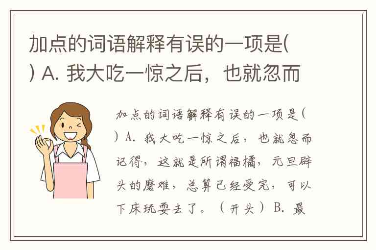 加点的词语解释有误的一项是( ) A. 我大吃一惊之后,也就忽而记得,这就是所谓福橘,元旦辟头的磨难,总算已经受完,可以下床玩耍去了。(开头) B. 最讨厌的是常喜欢切切察察。(拟声词,形容细碎的说话声音) C. 我似乎遇着了一个霹雳,全体都震悚起来。(大家) D. 我惧惮她什么呢!(害怕)