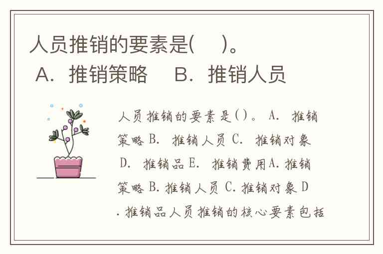 人员推销的要素是( )。 A.推销策略 B.推销人员 C.推销对象 D.推销品 E.推销费用A.推销策略 B.推销人员 C.推销对象 D.推销品