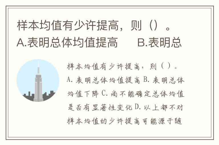 样本均值有少许提高,则()。A.表明总体均值提高 B.表明总体均值下降 C.尚不能确定总体均值是否有显著性变化 D.以上都不对