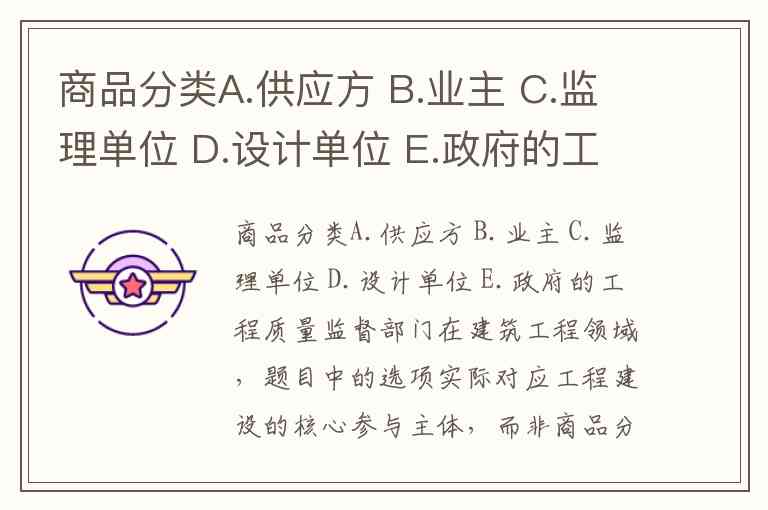 商品分类A.供应方 B.业主 C.监理单位 D.设计单位 E.政府的工程质量监督部门