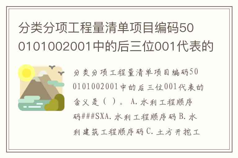 分类分项工程量清单项目编码500101002001中的后三位001代表的含义是( )。 A.水利工程顺序码###SXA.水利工程顺序码 B.水利建筑工程顺序码 C.土方开挖工程顺序码 D.清单项目名称顺序码