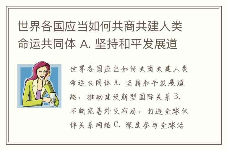 世界各国应当如何共商共建人类命运共同体 A. 坚持和平发展道路,推动建设新型国际关系 B. 不断完善外交布局,打造全球伙伴关系网络 C. 深度参与全球治理,积极引导国际秩序变革方向 D. 推动国际社会从伙伴关系、安全格局、经济发展、文明交流、生态建设等方面为建立人类命运共同体作出努力