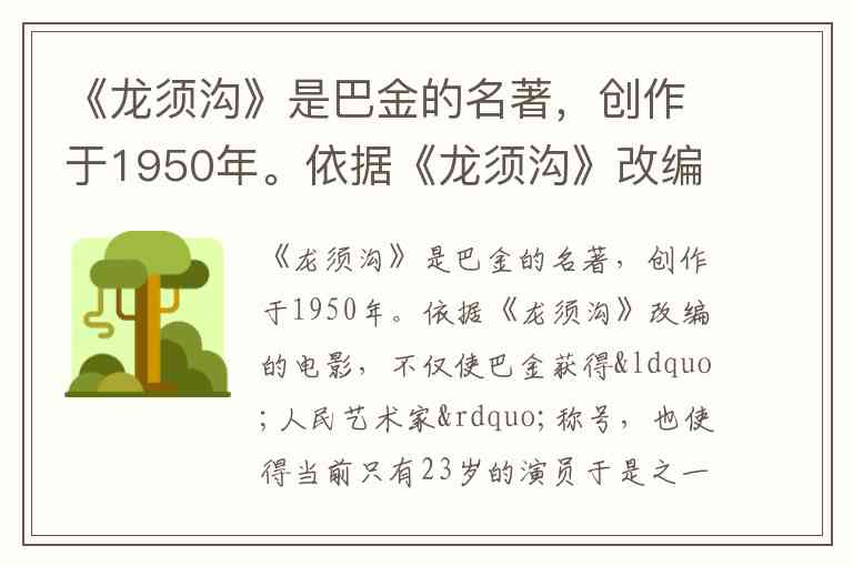 《龙须沟》是巴金的名著,创作于1950年。依据《龙须沟》改编的电影,不仅使巴金获得“人民艺术家”称号,也使得当前只有23岁的演员于是之一举成名。A.《龙须沟》 B.《家》 C.《李双双》 D.《老兵新传》