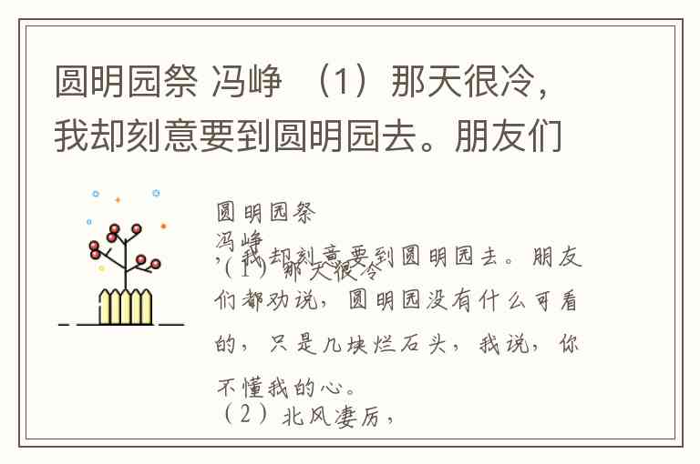 那天很冷,我却刻意要到圆明园去。朋友们都劝说,圆明园没有什么可看的,只是几块烂石头,我说,你不懂我的心。北风凄厉,草木萧疏,断壁残垣,一览无余。然而,在凄厉妁风雨声中,我却分明听到悠悠钟声,百鸟唱啁;透过萧疏草木,我看见了圆明之娇,长春之美,万春之秀,300亩园林春意正浓;断壁中,我看见了乾隆的题诗;残垣中,似见文源阁的浩翰藏书……我听见了来自法国130年前的一个深情的声音:……一个近超人的民族所能幻想到的一切都汇集于圆明园;……只要想象出一种无法描绘的建筑物,假如有一座集人类想象力之大成的灿烂宝窟,以宫殿庙宇的形象出现,那就是圆明园……啊,一个惜墨如金的世界文豪,用了无所不极的文字来称赞她!以至100多年后仍引起人们振颤的心共鸣。然而,对于玉焚香殒了的美人,祭奠者越是抒以赞美,痴情者越是悲伤,正如白居易写《长恨歌》、汤显祖写《还魂》……引得多少痴情男女欲悲欲死!此刻面对圆明园,我就是这种心情。我的心在哭,悲哀着美的逝去。我听见圆明园在哭泣,哭了100多年:以至我在遥远的南方也时常听见。圆明园在哭,哭护花无力;圆明园在泣,泣其悲惨遭遇渐被忘怀。我和圆明园在同声一哭!有好心人曾慷慨施舍,要把圆明园重修建。不管好心人如何,可我总要与刽子手杀死杨虎成后,在他英骸上建筑花圃这残酷的事实联想;我甚至联想到有人要把马嵬坡上的杨玉环的玉骨支起来,再披上半透明的比基尼。这是历史的悲哀!他们看不见圆明园的额头上“耻辱”两个黑字,他们听不到一个在屈辱中哭泣的母亲对她儿孙的声声嘱托以及希望着争气的未来。站在这写满血字的废墟上,我面对现实,拼搏未来!我见到了萧疏草木之上有苍郁的青松、冲天傲雪;我见到了熏烟的巨石峥嶙屹立,傲骨常在!100多年前,方才唱赞诗的雨果坚信:总有这样一天——解放了的而且把身上的污浊洗刷干净了的法兰西,将会把自己的赃物交还给被劫夺的。而我永远相信:有志气的炎黄子孙,决不会让那屈辱的历史重演!一定会在这古老的土地上巍然屹立,奔向辉煌的未来!