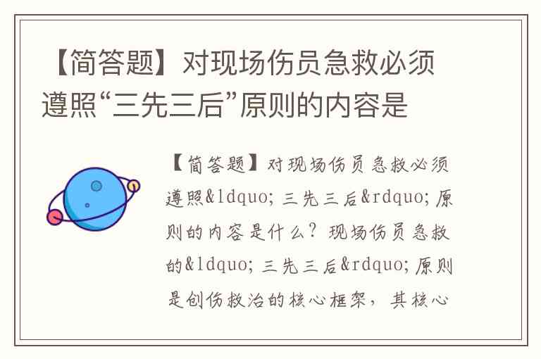 现场伤员急救的“三先三后”原则是创伤救治的核心框架,其核心思想是优先处理威胁生命的紧急情况,再进行后续处置。综合权威急救指南与临床实践,标准原则包含以下三组关键优先级: