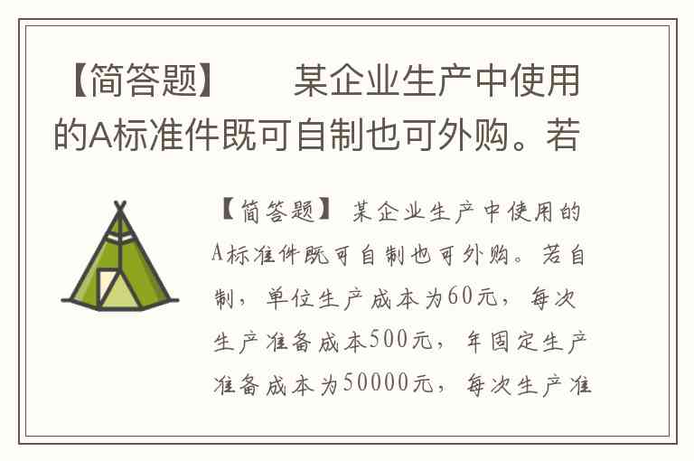 存货占用资金的资本成本:自制单位生产成本为60元,资本成本率10%,因此单位资本成本=单位生产成本×资本成本率=60×10%=6元/件。
