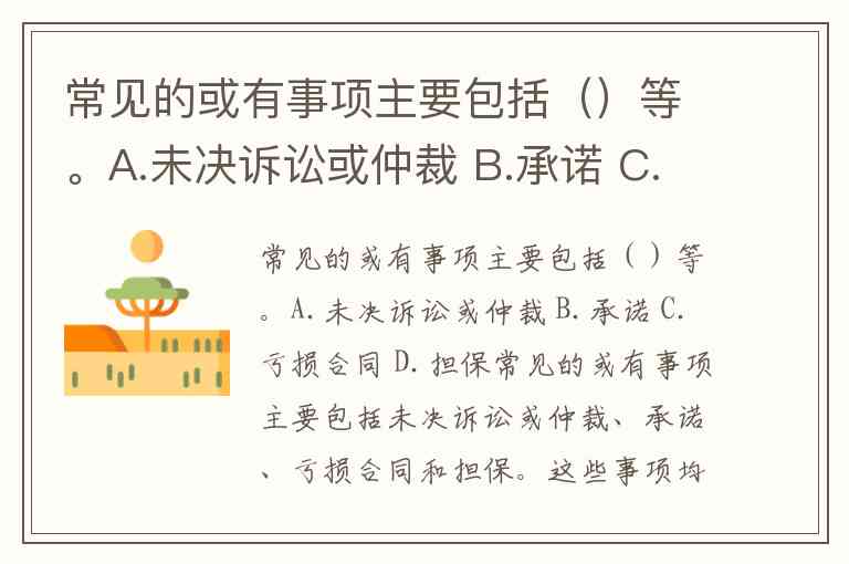 常见的或有事项主要包括未决诉讼或仲裁、承诺、亏损合同和担保。这些事项均符合或有事项的核心定义——由过去交易或事项形成,结果需由未来不确定事项决定的状况。
