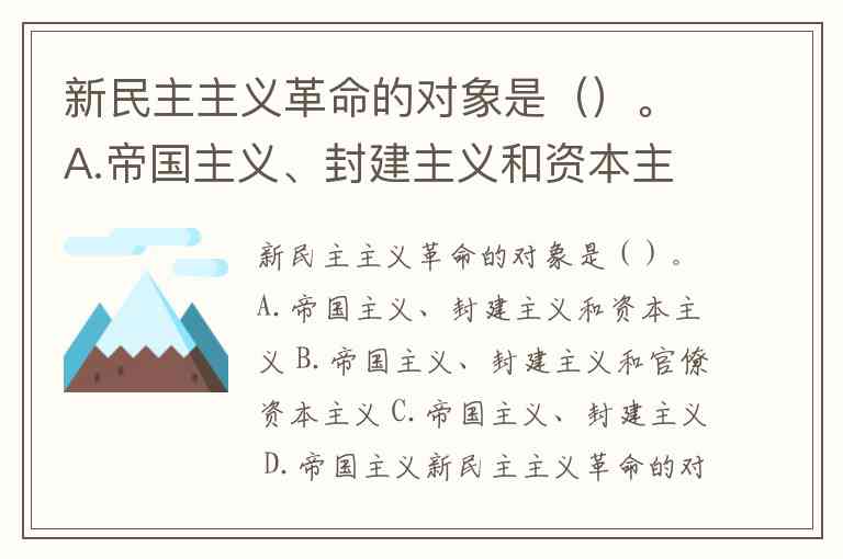 新民主主义革命的对象是()。A.帝国主义、封建主义和资本主义 B.帝国主义、封建主义和官僚资本主义 C.帝国主义、封建主义 D.帝国主义