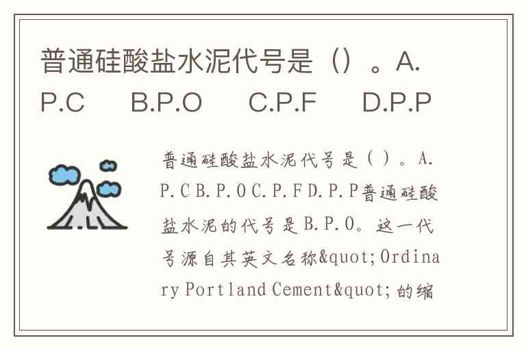 普通硅酸盐水泥的代号是 B.P.O。这一代号源自其英文名称"Ordinary Portland Cement"的缩写,由"P"(Portland)和"O"(Ordinary)组成,在国内建筑工程及产品标识中被广泛使用。