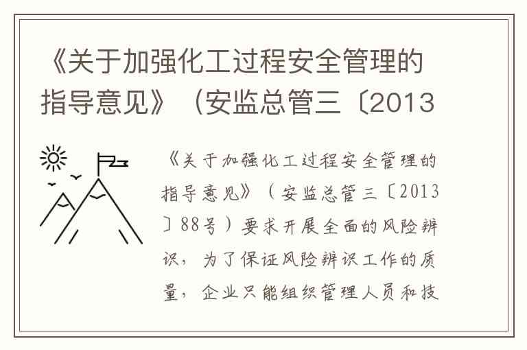 《关于加强化工过程安全管理的指导意见》(安监总管三〔2013〕88号)明确要求企业组织所有人员参与风险辨识分析,而非仅管理人员和技术人员。这一规定体现了"全员参与"的风险管理理念,旨在通过基层操作人员的一线经验补充专业分析,实现风险辨识的全面覆盖。