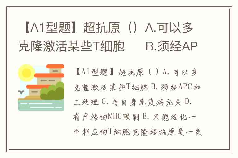 【A1型题】超抗原()A.可以多克隆激活某些T细胞 B.须经APC加工处理 C.与自身免疫病无关 D.有严格的MHC限制 E.只能活化一个相应的T细胞克隆