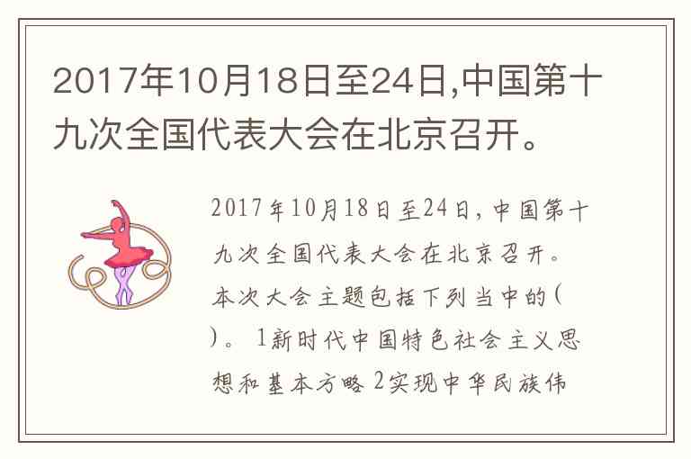 2017年10月18日至24日,中国第十九次全国代表大会在北京召开。本次大会主题包括下列当中的( )。 1新时代中国特色社会主义思想和基本方略 2实现中华民族伟大复兴的中国梦不懈奋斗 3不忘初心,牢记使命,高举中国特色社会主义伟大旗帜 4决胜全面建成小康社会,夺取新时代中国特色社会主义伟大胜利 A. ①②③ B. ①②④ C. ①③④ D. ②③④