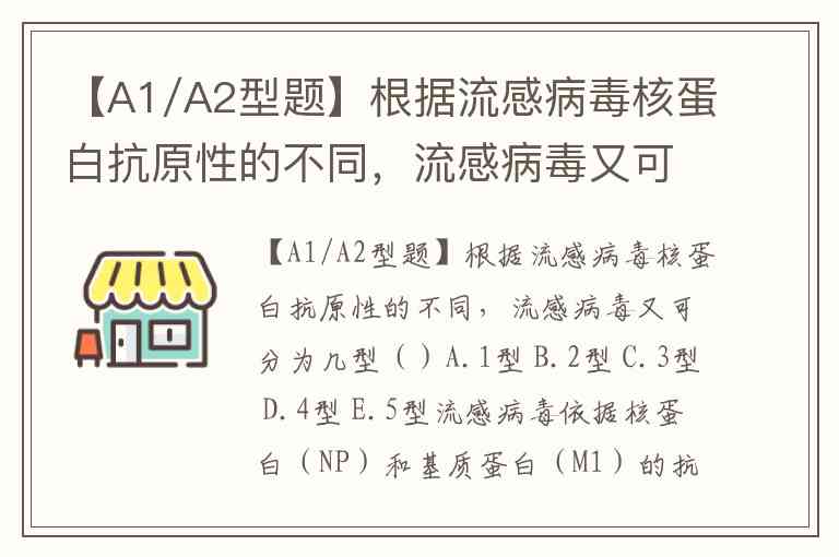 【A1/A2型题】根据流感病毒核蛋白抗原性的不同,流感病毒又可分为几型()A.1型 B.2型 C.3型 D.4型 E.5型