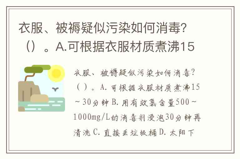 衣服、被褥疑似污染如何消毒?()。A.可根据衣服材质煮沸15~30分钟 B.用有效氯含量500~1000mg/L的消毒剂浸泡30分钟再清洗 C.直接丢垃圾桶 D.太阳下暴晒4小时