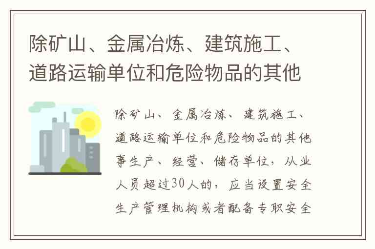 除矿山、金属冶炼、建筑施工、道路运输单位和危险物品的其他事生产、经营、储存单位,从业人员超过30人的,应当设置安全生产管理机构或者配备专职安全生产管理人员。()