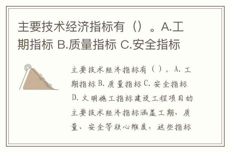 建设工程项目的主要技术经济指标涵盖工期、质量、安全等核心维度,这些指标从不同层面反映项目的技术可行性与经济合理性。根据施工组织设计及项目管理规范,A.工期指标、B.质量指标、C.安全指标均属于关键技术经济指标,而文明施工指标通常作为管理要求而非核心技术经济评价参数。