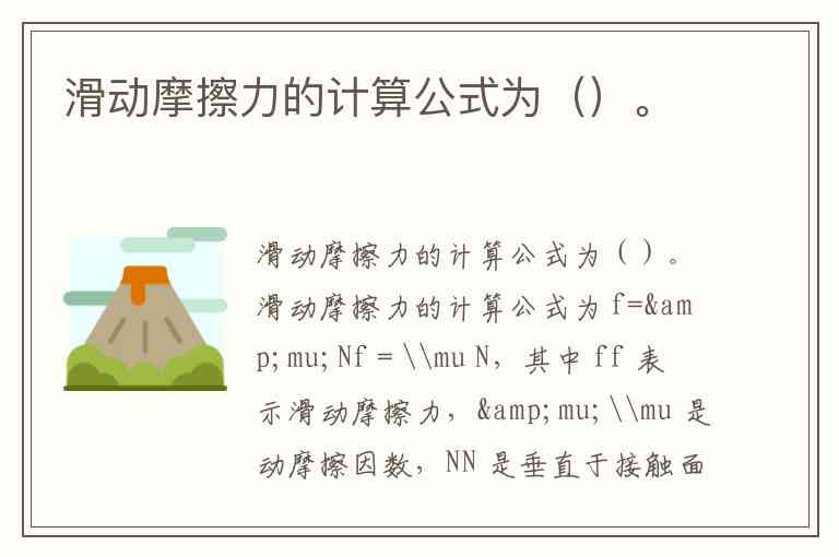 滑动摩擦力的计算公式为 ,其中 表示滑动摩擦力, 是动摩擦因数, 是垂直于接触面的正压力。这一公式表明滑动摩擦力的大小与两个因素直接相关:接触面的粗糙程度(由 量化)和物体间的挤压程度(由 表示),而与接触面积、滑动速度等常见误解因素无关。