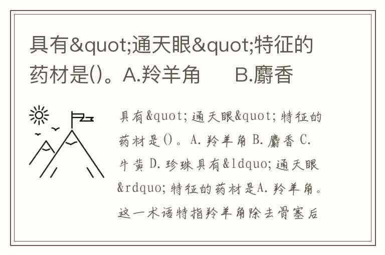 具有“通天眼”特征的药材是A.羚羊角。这一术语特指羚羊角除去骨塞后,对光透视可见中心有一条扁三角形小孔直通尖端的鉴别特征,是其独有的性状标识。