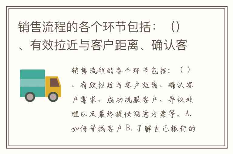 销售流程的各个环节包括:()、有效拉近与客户距离、确认客户需求、成功说服客户、异议处理以及最终提供满意方案等。A.如何寻找客户 B.了解自己银行的产品 C.加强服务意识 D.制定销售计划