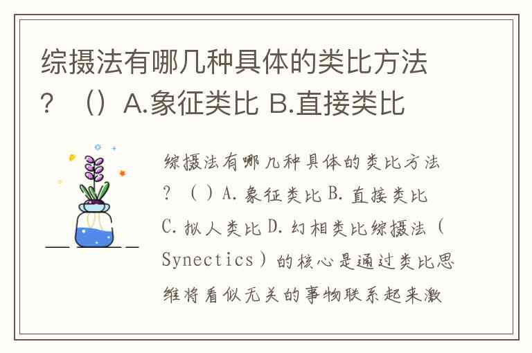 综摄法(Synectics)的核心是通过类比思维将看似无关的事物联系起来激发创新,其经典类比方法包括拟人类比、直接类比和象征类比,部分理论还扩展至想象类比等类型。以下是具体分类及解析: