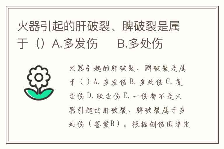 火器引起的肝破裂、脾破裂属于多处伤(答案B)。根据创伤医学定义,多处伤指同一解剖部位或脏器发生两处以上损伤,而本例中肝、脾虽为不同脏器,但均由火器这一单一伤因导致,符合多处伤"同一伤因造成多个部位损伤"的核心特征。