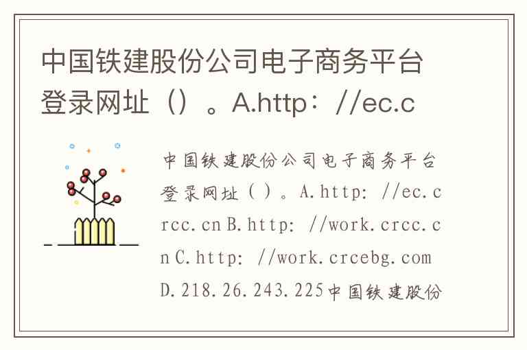 中国铁建股份公司电子商务平台登录网址()。A.http://ec.crcc.cn B.http://work.crcc.cn C.http://work.crcebg.com D.218.26.243.225