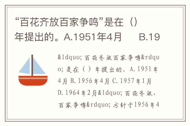 “百花齐放百家争鸣”是在()年提出的。A.1951年4月 B.1956年4月 C.1957年1月 D.1964年2月