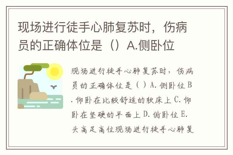 现场进行徒手心肺复苏时,伤病员的正确体位是()A.侧卧位 B.仰卧在比较舒适的软床上 C.仰卧在坚硬的平面上 D.俯卧位 E.头高足高位