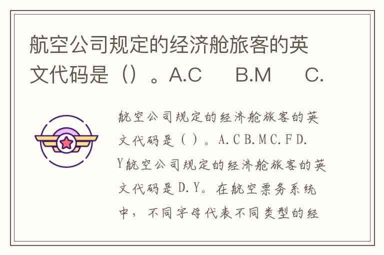 航空公司规定的经济舱旅客的英文代码是 D.Y。在航空票务系统中,不同字母代表不同类型的经济舱机票,其中 Y舱为普通舱公布价,即全价经济舱,是经济舱的基础代码。其他常见经济舱代码还包括折扣票(如M舱7折、H舱8.5折)、特殊群体票(如X舱学生票5折、Q舱教师票6折)等,但Y舱作为基准代码,通常代表标准经济舱。