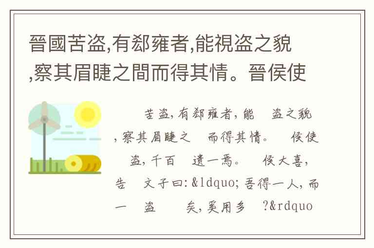晉國苦盗,有郄雍者,能視盗之貌,察其眉睫之間而得其情。晉侯使視盗,千百無遗一焉。晉侯大喜,告趙文子曰:“吾得一人,而一國盗爲盡矣,奚用多爲?”文子曰:“吾君恃伺察而得盜,盗不盡矣。且郄雍必不得其死焉。”俄而羣盗謀曰:“吾所窮者,郄雍也。”遂共盗而殘之。晉侯聞而大駭,立召文子而告之曰:“果如子言,郄雍死矣。然取盗何方?”文子曰:“周諺有言:察見渊魚者不样,智料隱匿者有殃。且君欲無盜,莫若舉賢而任之,使敎明於上,化行於下,民有恥心,則何盜之爲?”於是用隨會知政,而羣盗(奔)秦焉。解析文中加着重号词语的意思。奔: